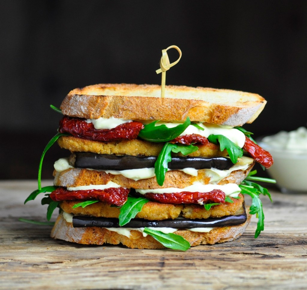 E’ composto di tre fette di pane casereccio farcite con Crocche pollo felice, fette grigliate di melanzana, pomodori secchi sott’olio, rucola e veg-maionese.