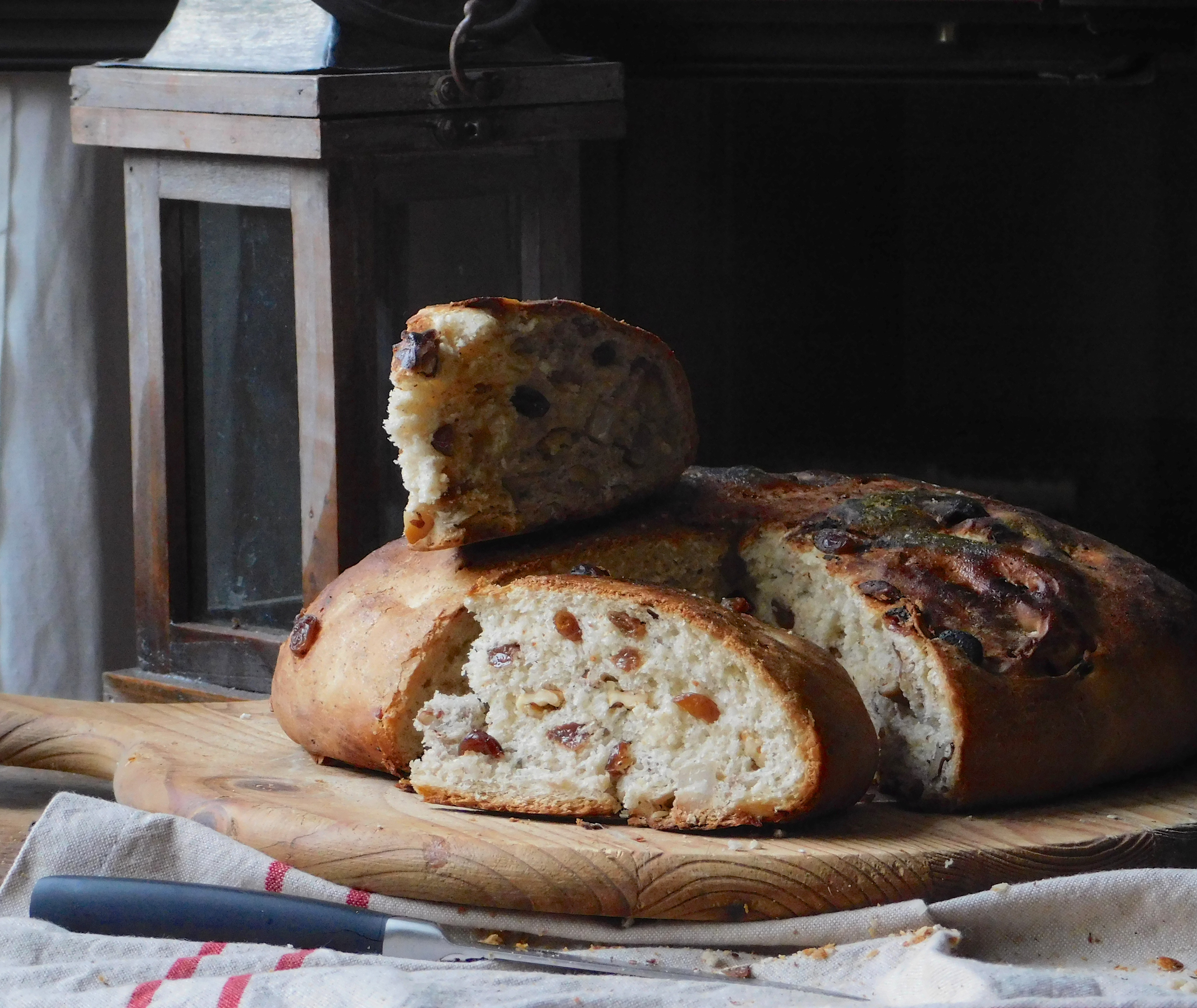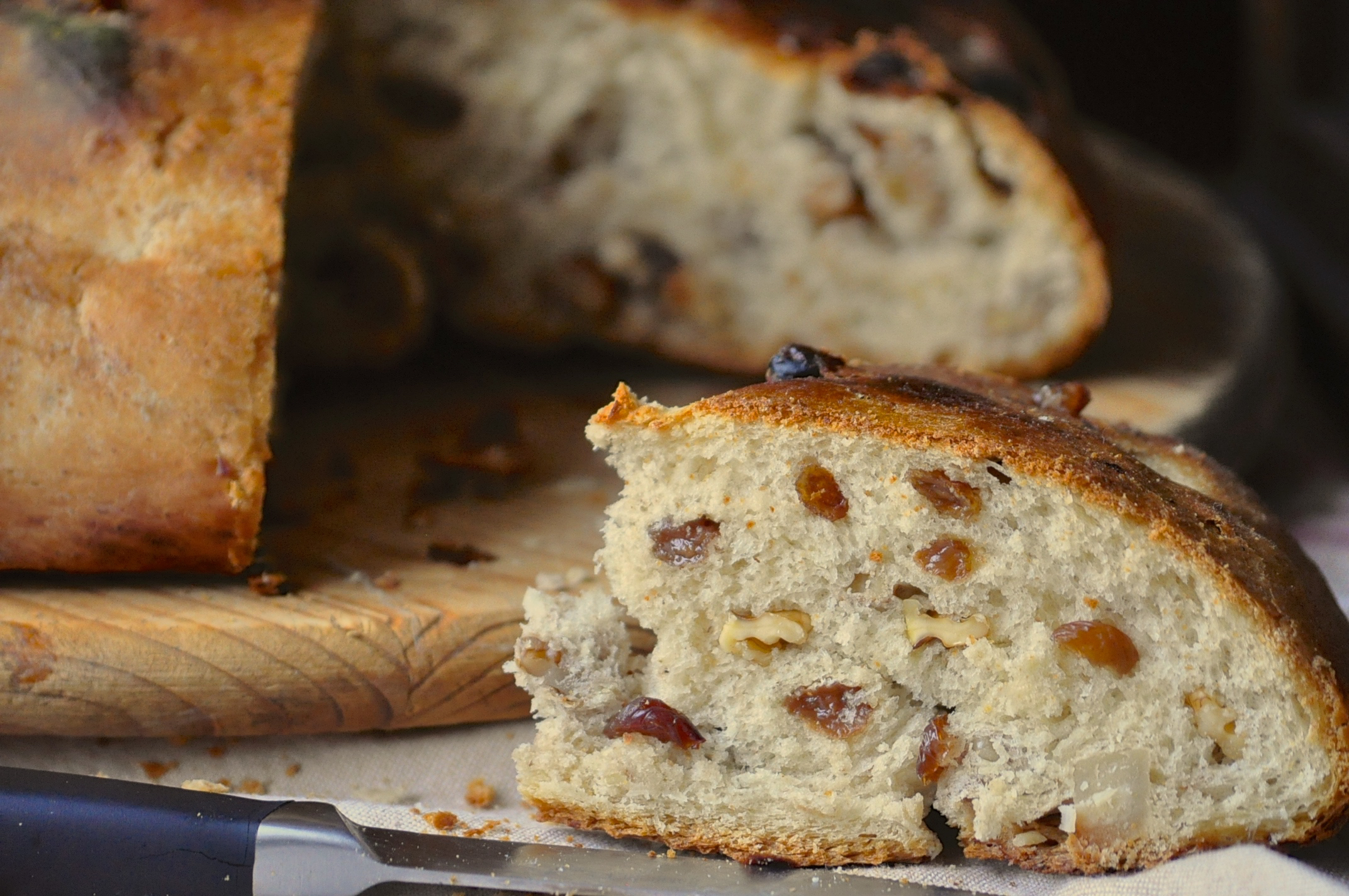 Ora aggiungete gradualmente le noci spezzettate e l’uvetta cercando di distribuirle in modo uniforme. Formate una palla e mettetela direttamente sulla teglia rivestita di carta da forno. Ungete leggermente l’impasto, incidete una croce sulla sommità e mettete in forno spento a lievitare.