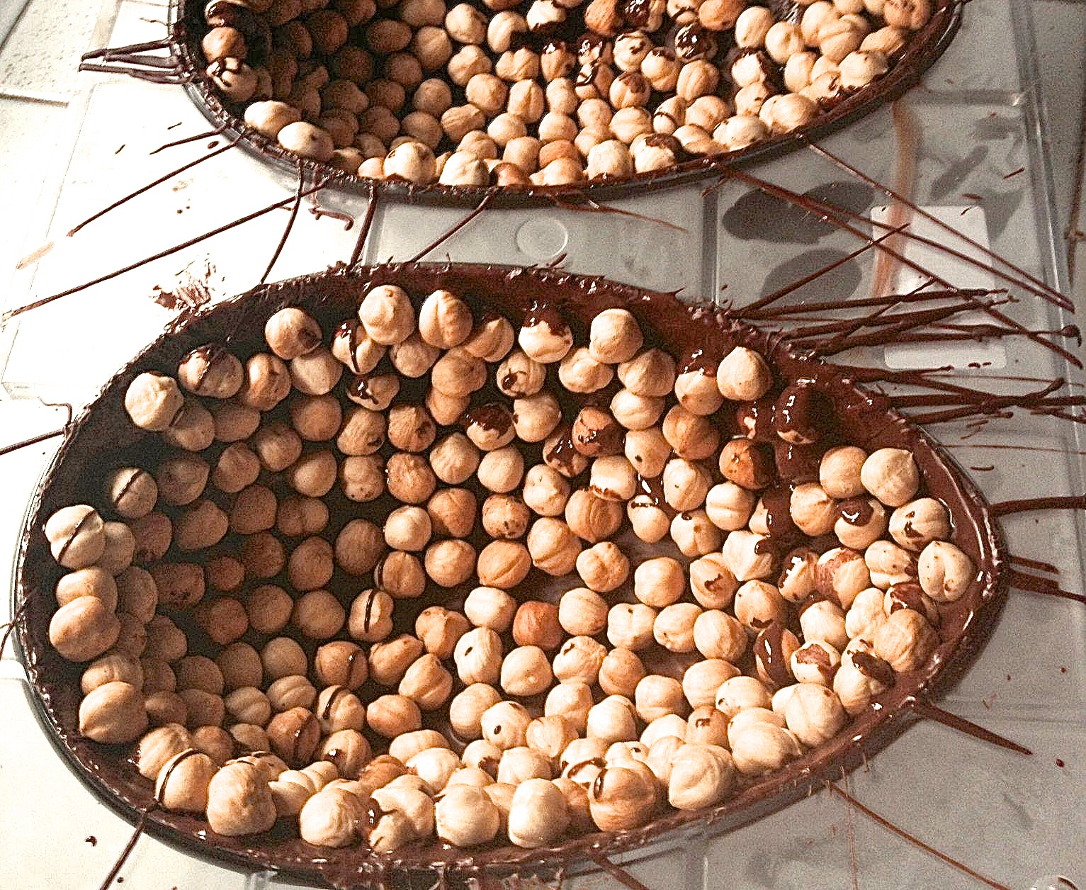 Lasciate le 2 parti dell’uovo nello stampo. Pennellate la superficie interna col cioccolato sciolto e attaccate pazientemente le nocciole su tutta la superficie.