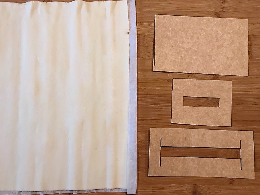 Accendete il forno a 200°, srotolate la pasta sfogliata e ritagliate le forme che avrete realizzato col cartoncino (vedi foto) della misura che preferite. Serviranno 3 basi, i 2 lati lunghi della cassetta, i due lati corti e 4 bastoncini per gli angoli della cassetta. Spennellate con lo sciroppo d’agave per dare colore, infornate per circa 10 minuti. Sfornate e fate raffreddare.