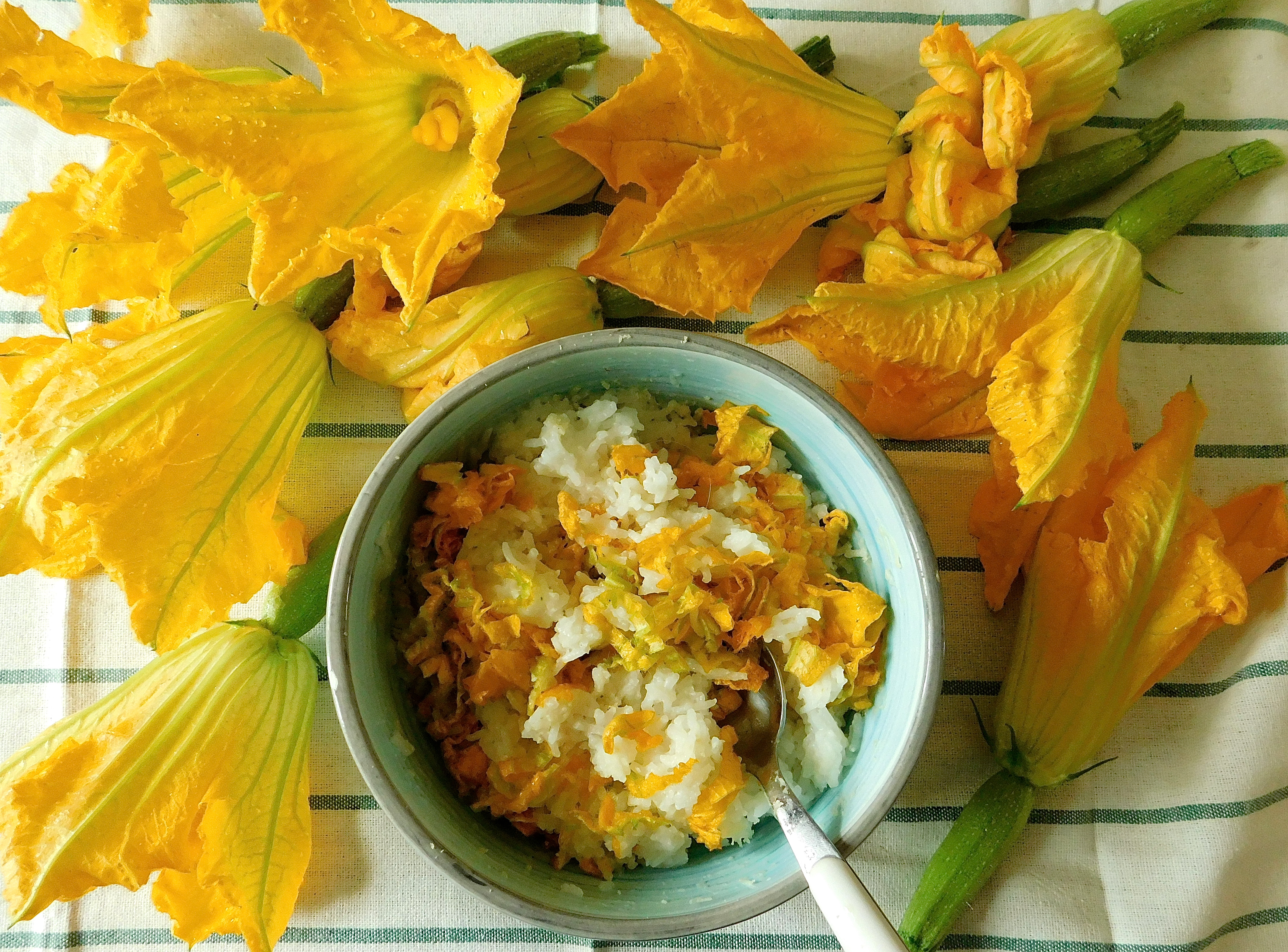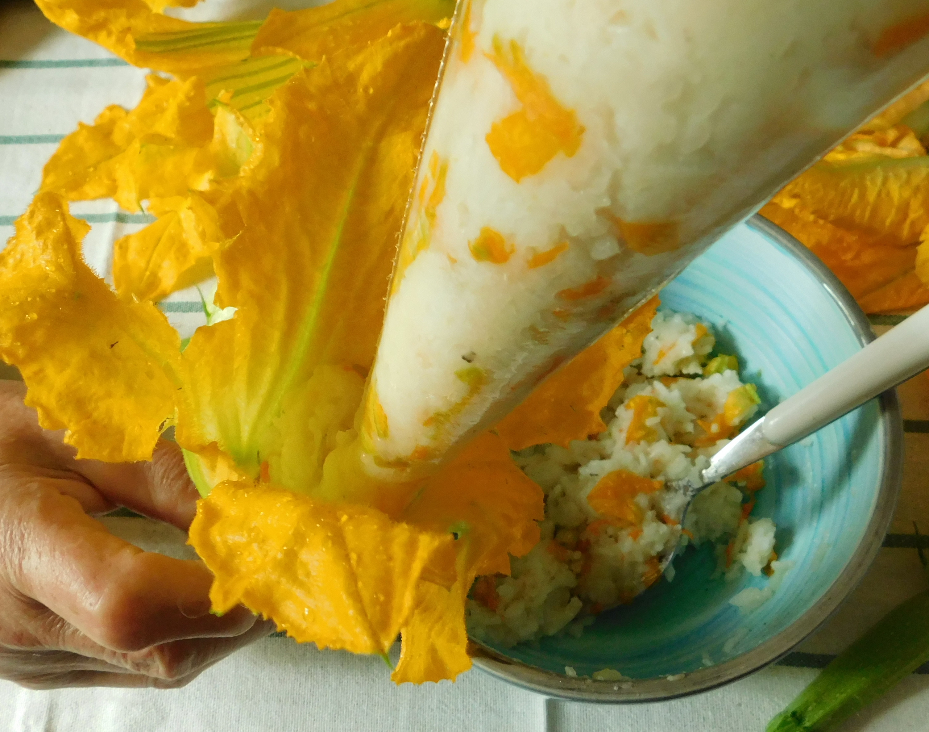 Togliete i pistilli ai fiori con lo zucchino, riempiteli abbondantemente di riso e ripiegate i petali per sigillare.