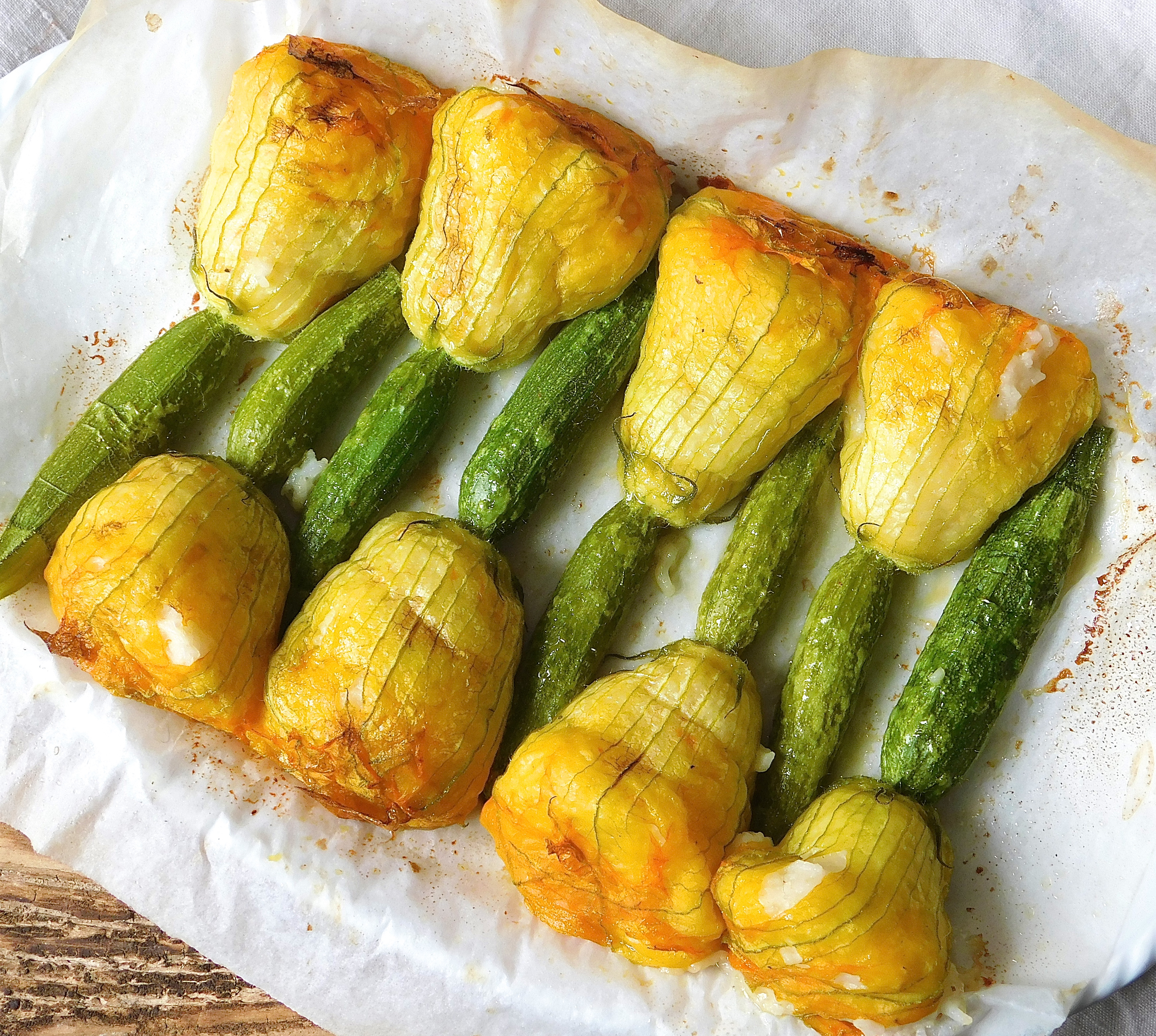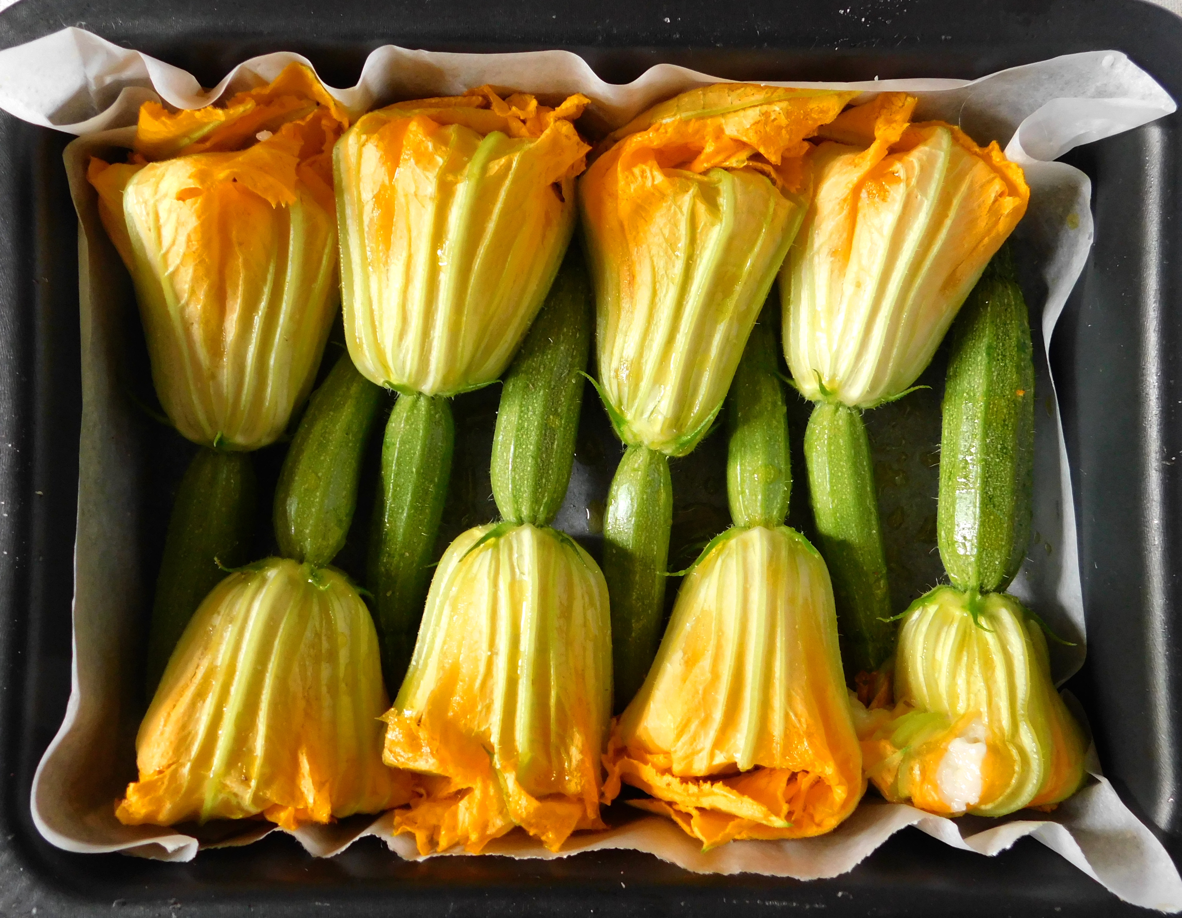 Disponete i fiori ripieni in una teglia rivestita di carta forno appena unta, salate leggermente, irrorate con un filo di olio, coprite la teglia con un foglio di alluminio e mettete in forno per 30 minuti.