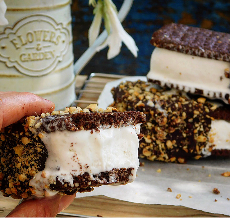 Componete i Maxiveg mettendo una mattonella di gelato tra 2 biscotti. Premete leggermente per farli aderire e metteteli di nuovo in freezer.