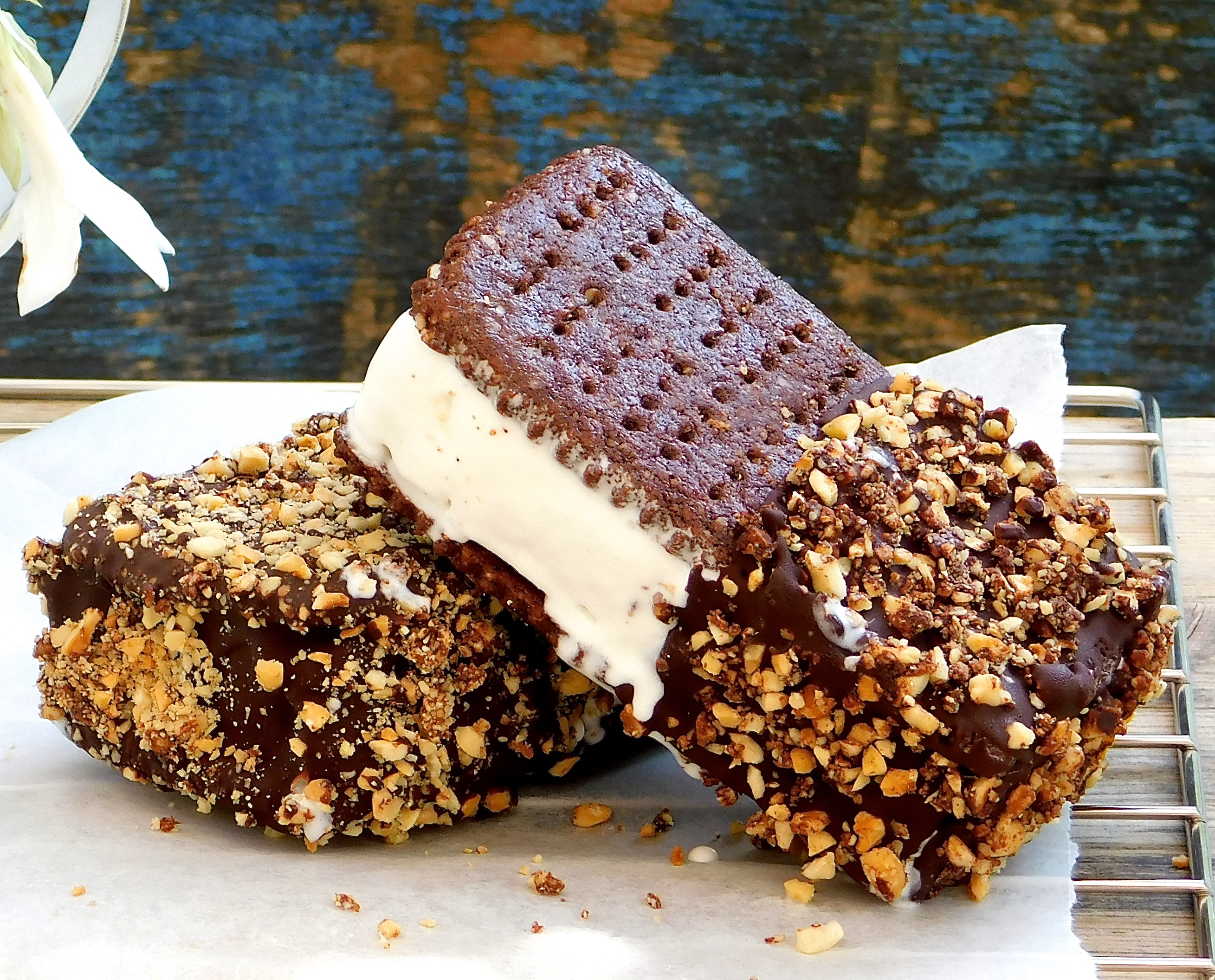 Quando il gelato sarà completamente indurito estraetelo, tagliatelo a mattonelle delle stesse dimensioni dei biscotti e riponetelo di nuovo in freezer.