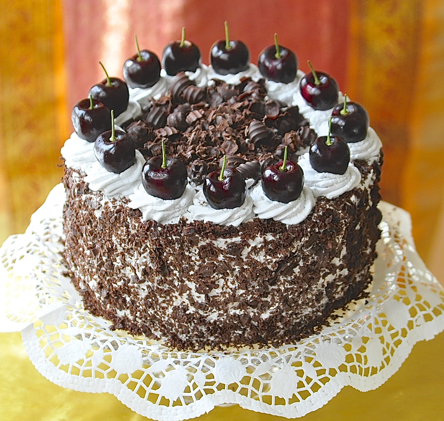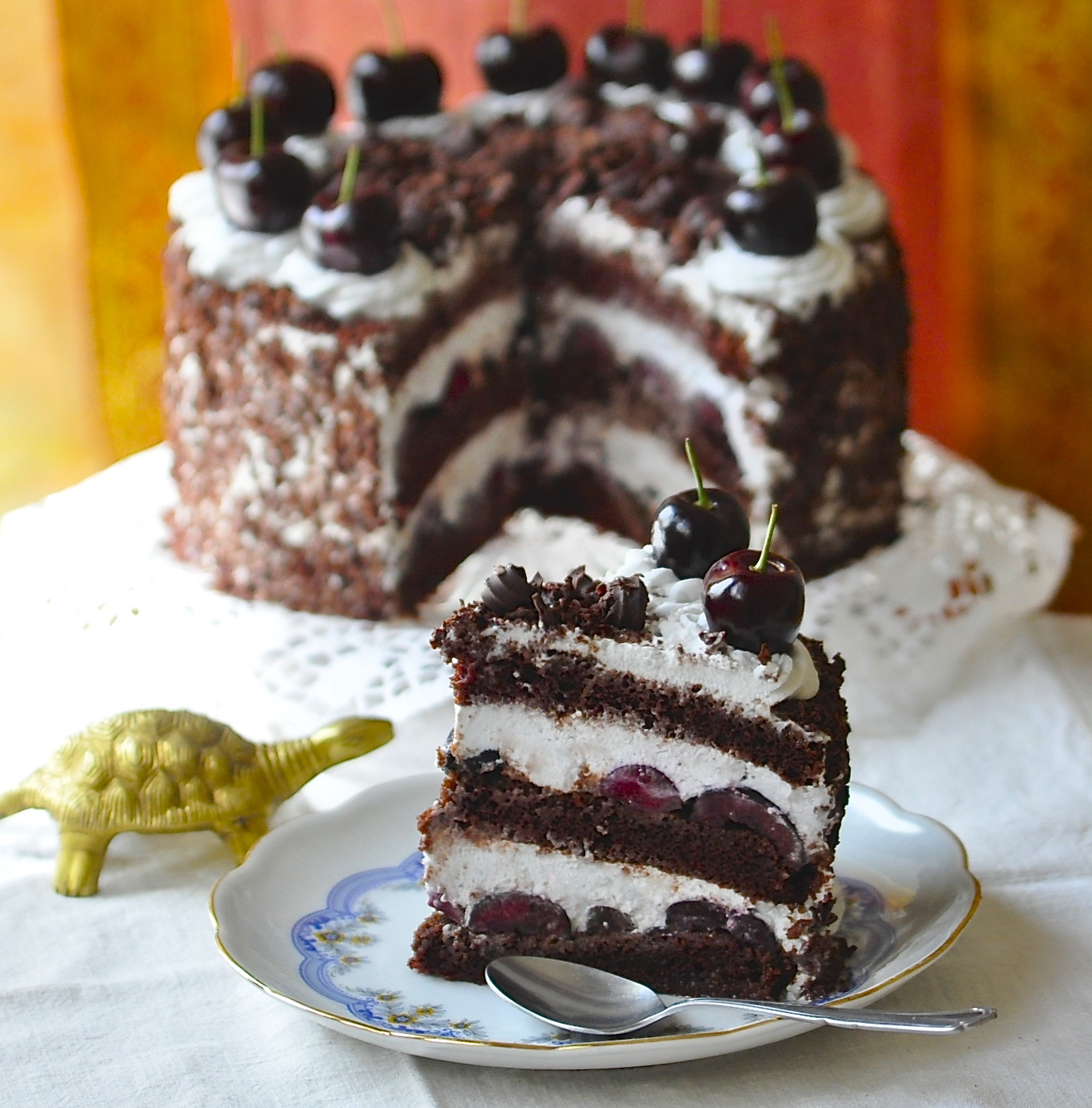 Appoggiate uno dei dischi di pan di spagna sul piatto di portata, spennellate uniformemente con la bagna, distribuite le ciliegie denocciolate oppure quelle sciroppate. Ricoprite con un generoso strato di panna. Appoggiate il secondo disco e ripetete l’operazione. Terminate col terzo disco che spennellerete con la bagna.