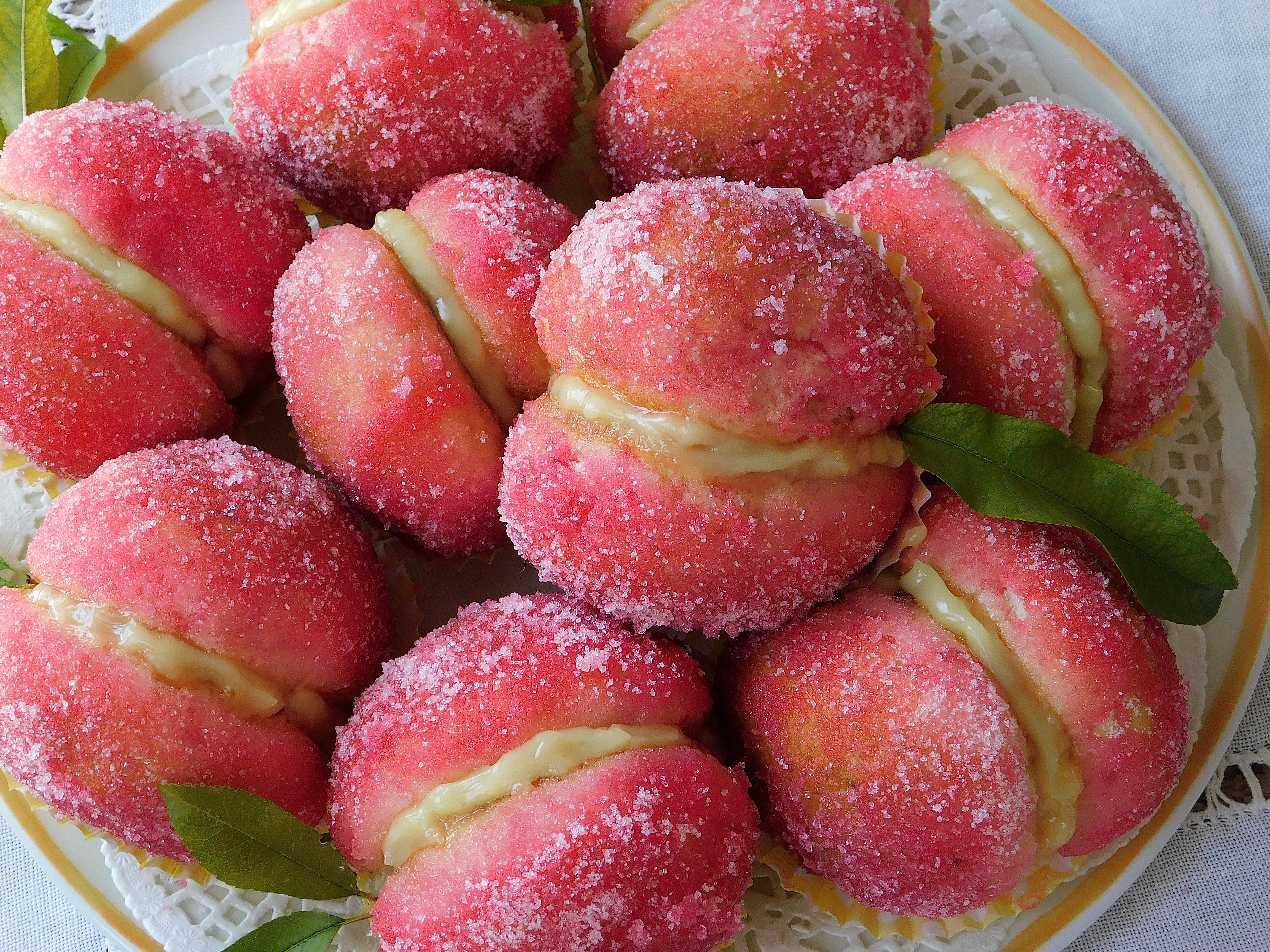 Svuotate leggermente la parte inferiore delle pagnottine, inumiditele con la bagna, posizionate al centro un cucchiaino di crema pasticciera. Unite le due metà, spennellate la pesca con la bagna e passatela nello zucchero semolato. Adagiate le pesche nei pirottini.