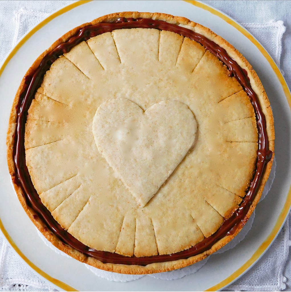Stendete altra sfoglia e ricavate un cerchio del diametro di circa 2 cm in meno di quello della tortiera. Ricavate anche un cuore. Posizionate il cerchio sulla teglia rivestita di carta da forno, appoggiate il cuore al centro, praticate delle incisioni lungo la circonferenza. Mettete in forno a 180° per 10 minuti, facendo attenzione che non si colori troppo. Lasciate raffreddare.