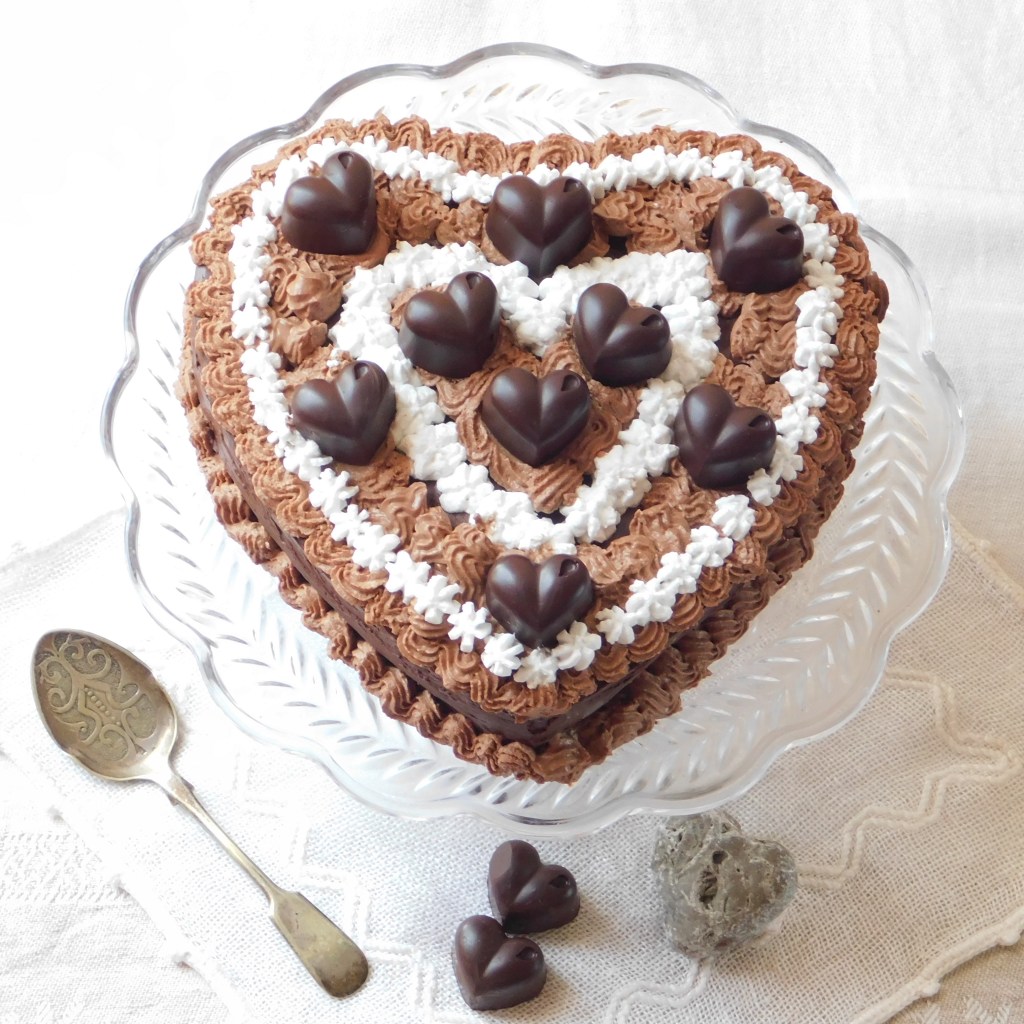 Appoggiate il primo cuore sul piatto di portata. Bagnatelo generosamente con la bagna, stendete un abbondante strato di crema al cioccolato, (lasciatene da parte 3 o 4 cucchiai) ricoprite col secondo cuore e ripetete l’operazione. Chiudete col terzo cuore e bagnate anche questo. Ricoprite con la pellicola, pressate leggermente e riponete in freezer per mezz’ora.